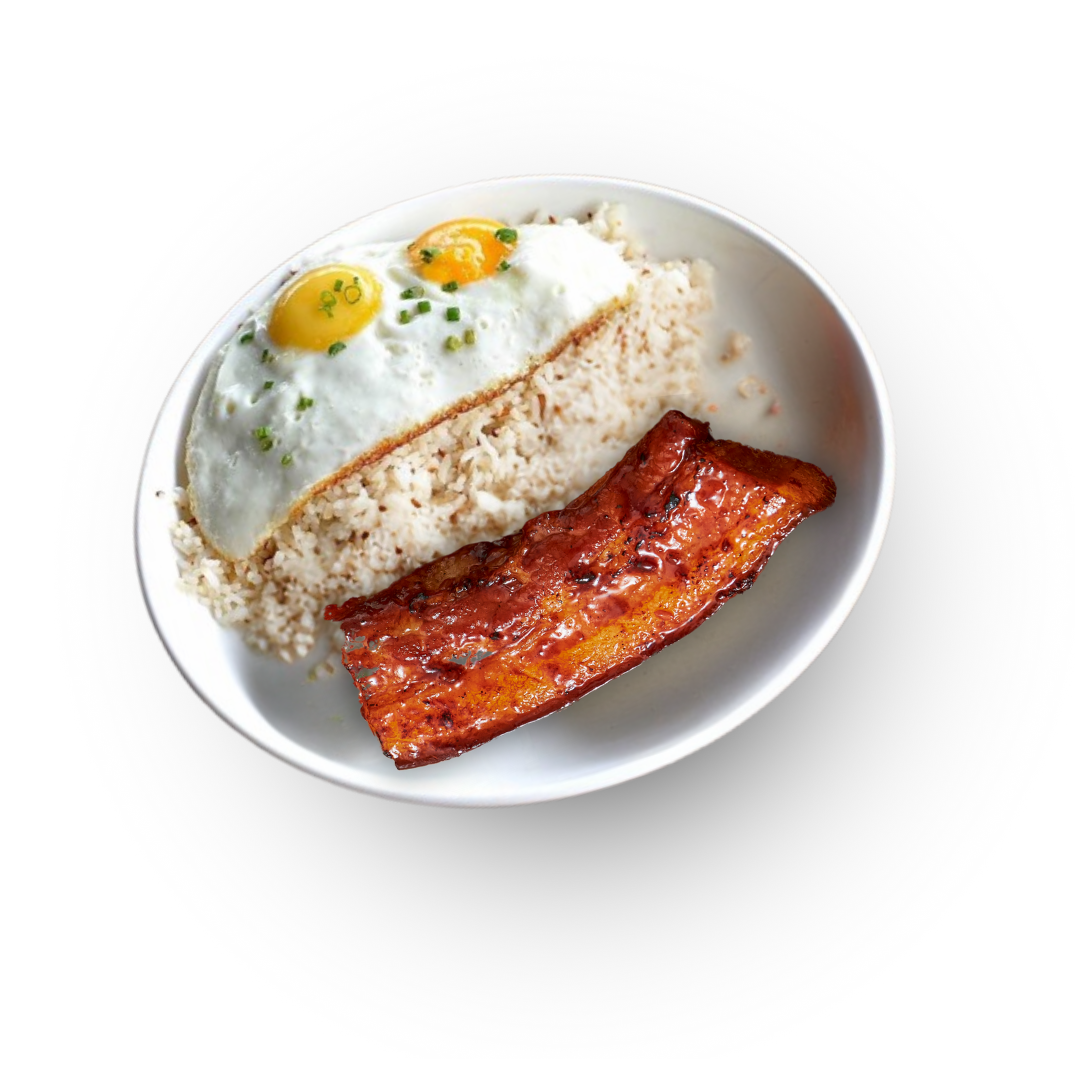 Grilled pork belly served with garlic rice,eggs and atchara
