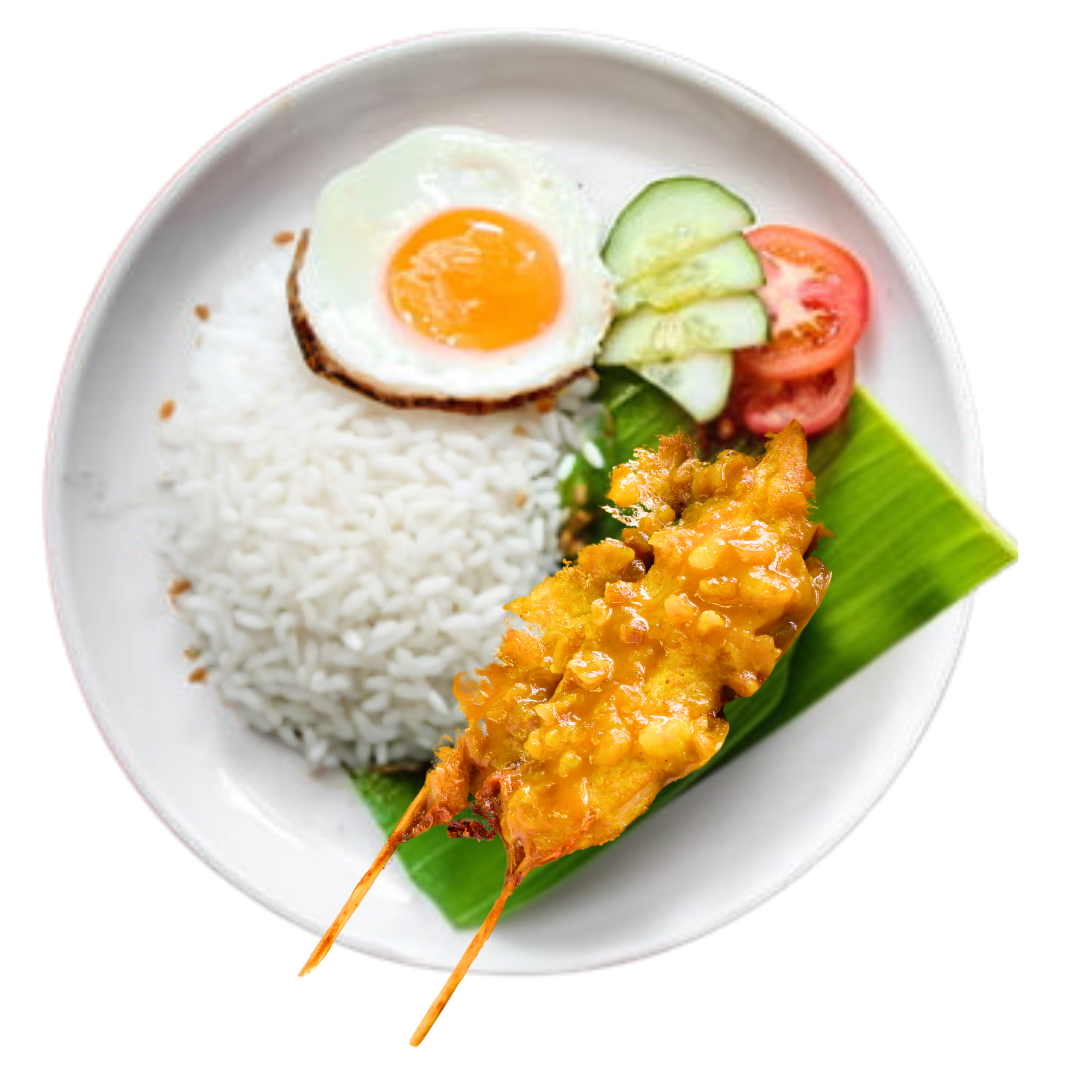 Grilled spiced chicken skewers drizzled with peanut sauce served with rice, fried egg, and cucmber slices