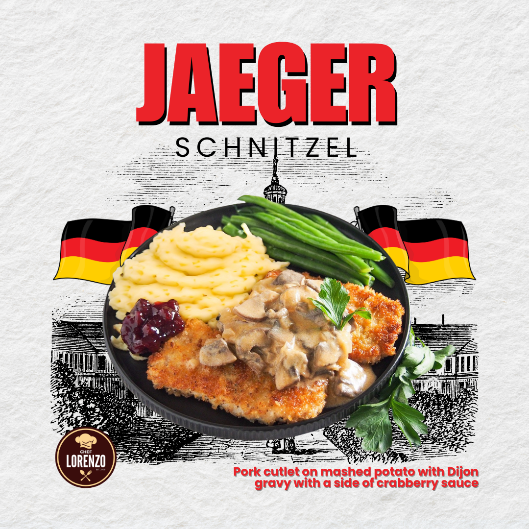 Pork cutlet with mashed potato topped with dijon gravy with a side of cranberry sauce