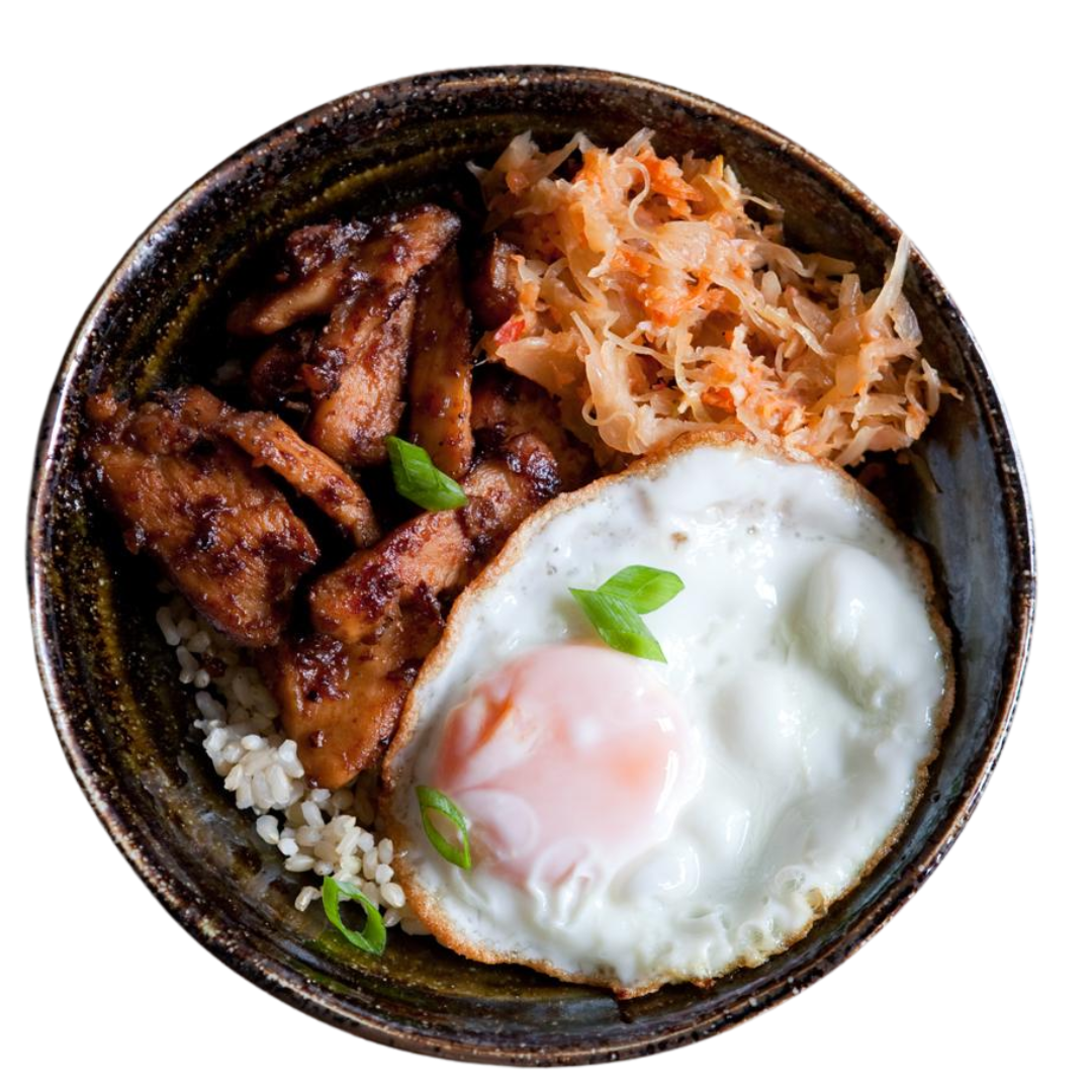 Sweet and savory grilled chicken pieces on rice topped with egg.