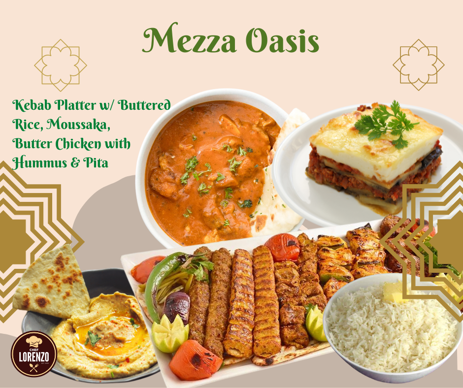 Middle Eastern themed dishes includes Kebab Platter with buttered rice, Moussaka, Butter chicken, Hummus and Pita bread