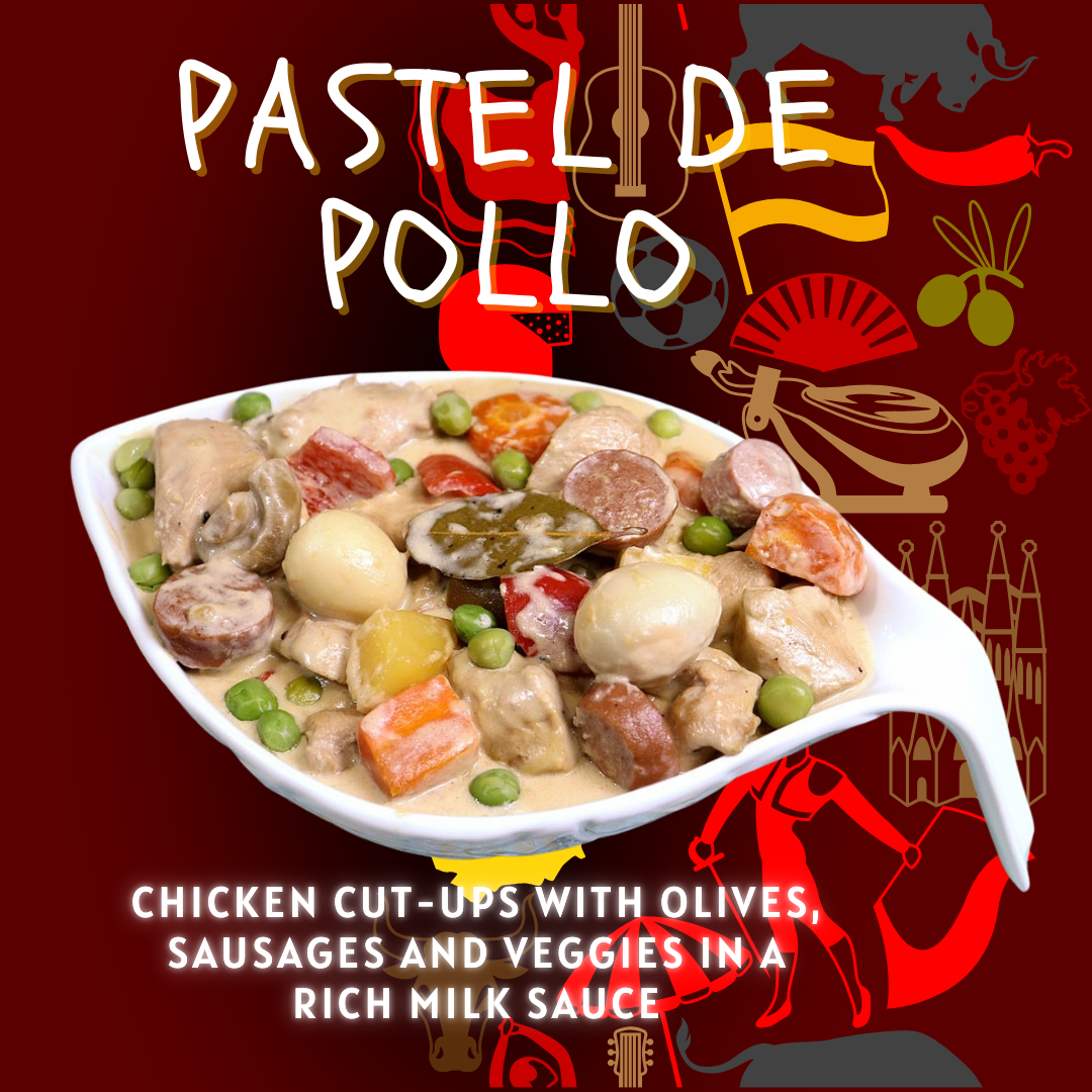 Chicken cut-ups with olives, sausages and veggies in a rich milk sauce