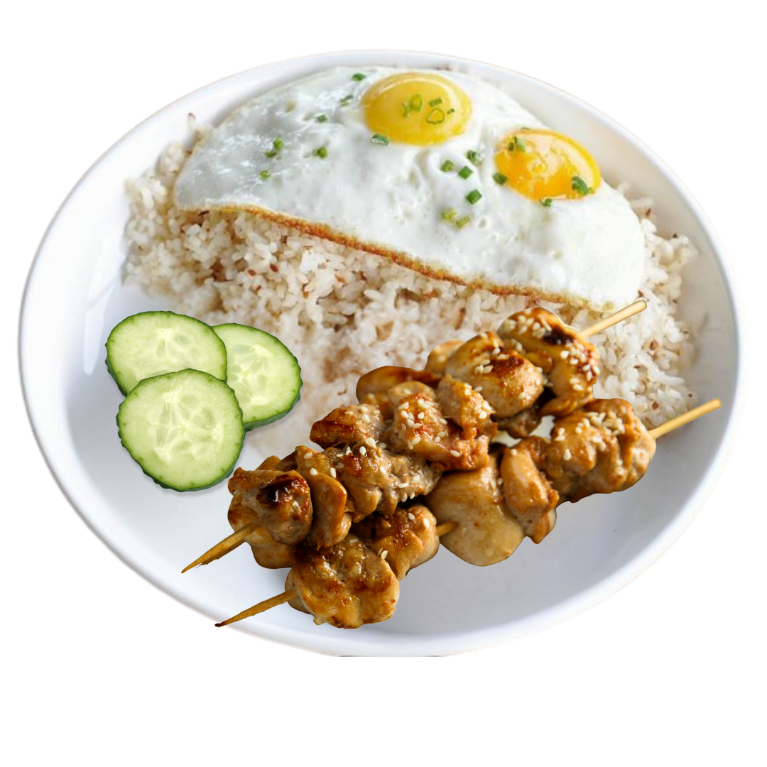 Grilled Malaysian style boneless chicken with rice and fried eggs