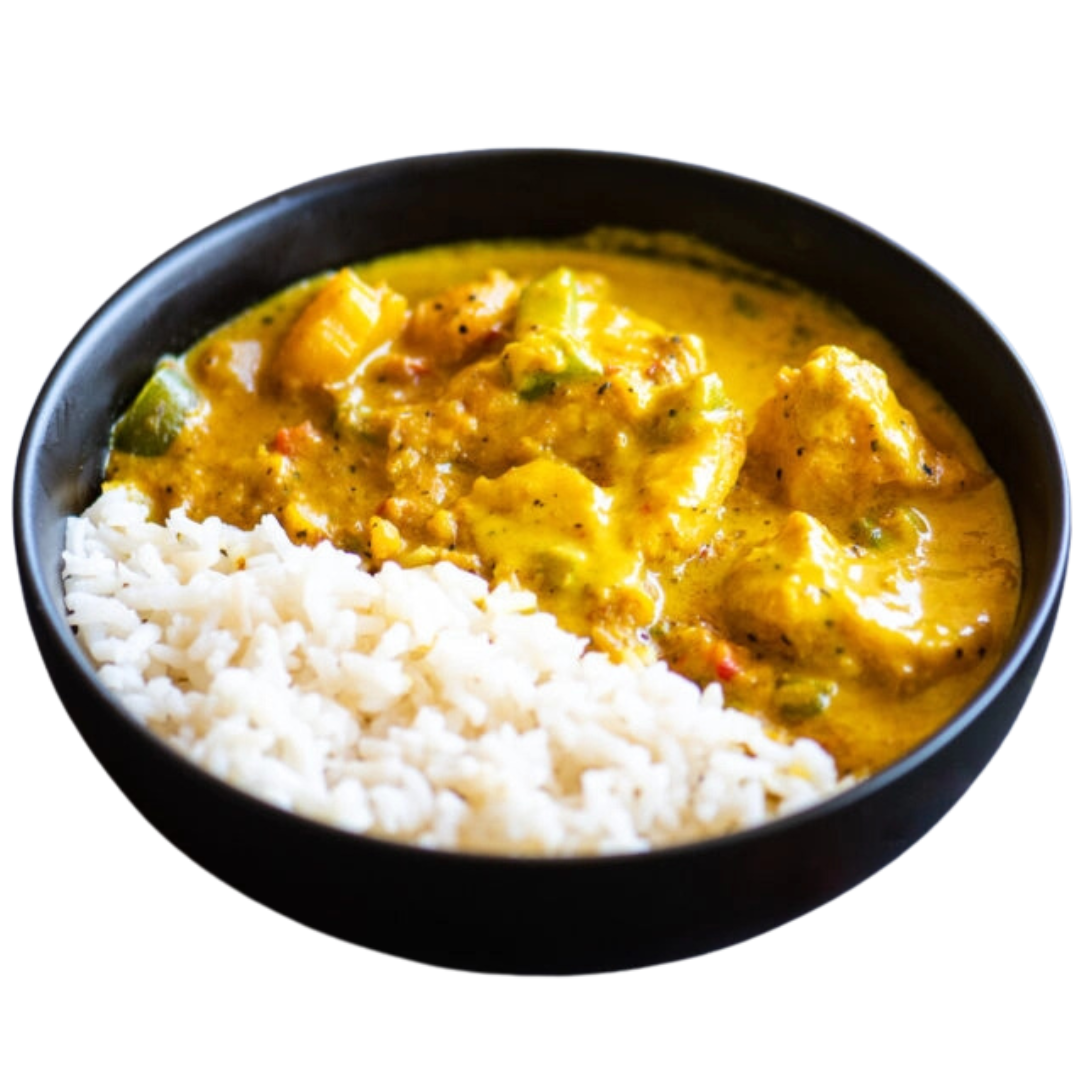 Pan-seared cobbler fish in yellow curry and veggies served with rice.