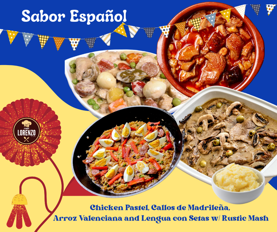 Spanish themed dishes includes Lengua with mashed potato and mixed veggies, Callos Ala Madrileña, Chicken Pastel, and Aroz Valenciana