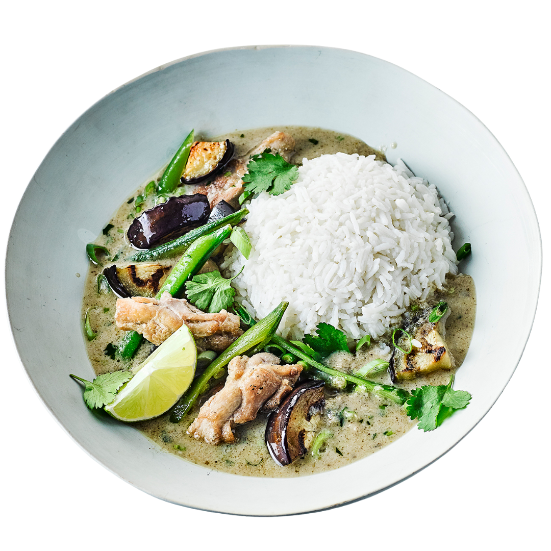 Chicken cut-ups braised in coconut milk and green curry, with winged beans and eggplants, served with rice